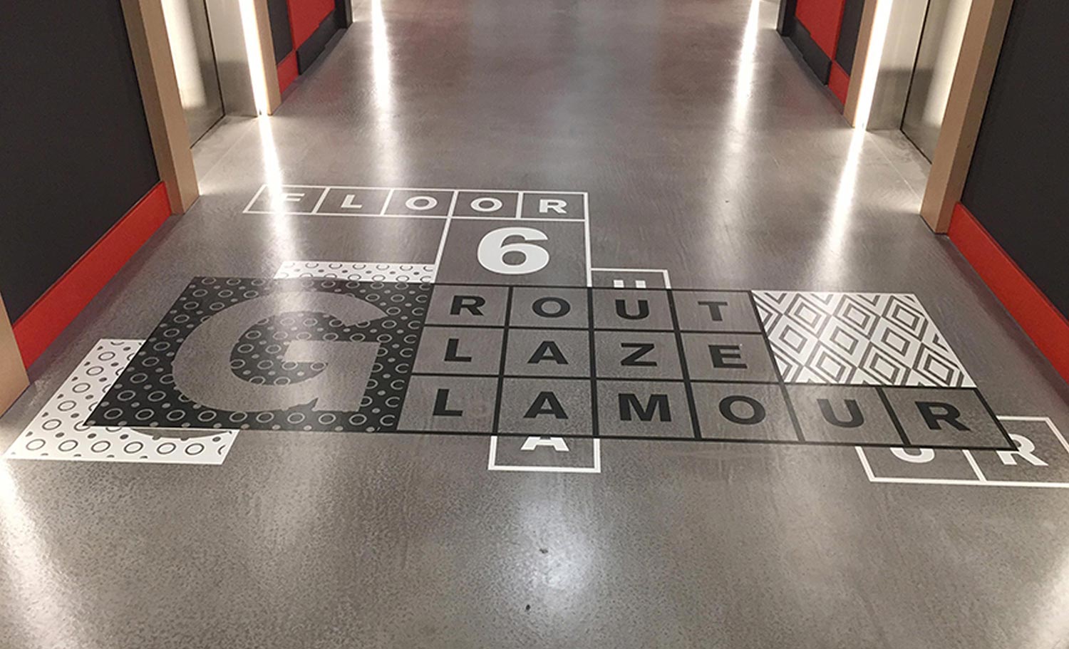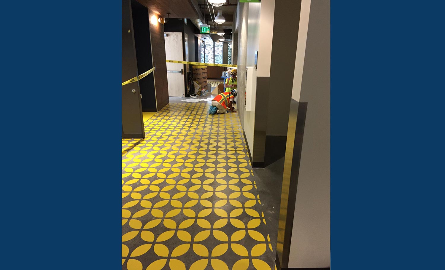 We were contracted to paint a variety of very unique and complex stencils with an array of challenges. Epoxy floor paints on raw concrete with a clear coat for protection, stencils on the spines of books, interact wall graphics, multiple layer stencils, stencils and complex patterns on pegboards. All in a compressed schedule that was on the critical path for the buildings scheduled opening. Washington Commercial Painters not only finished ahead of schedule but under budget.