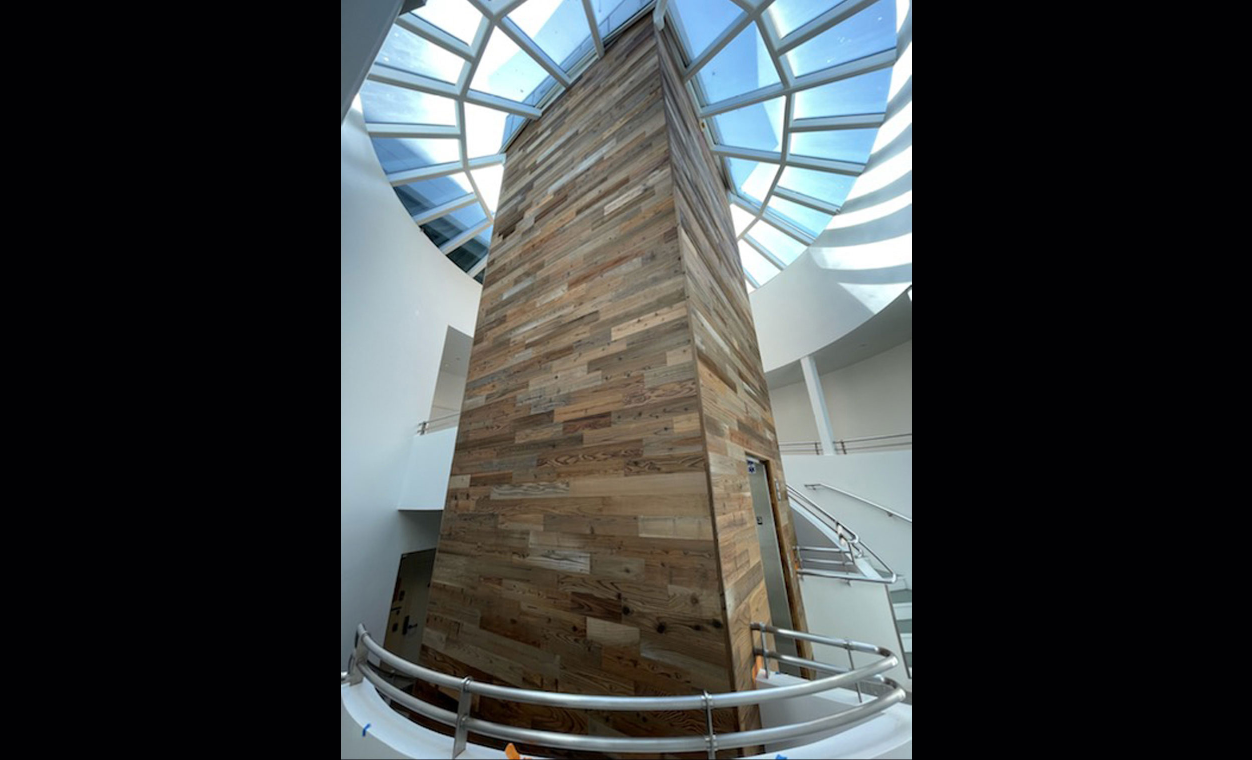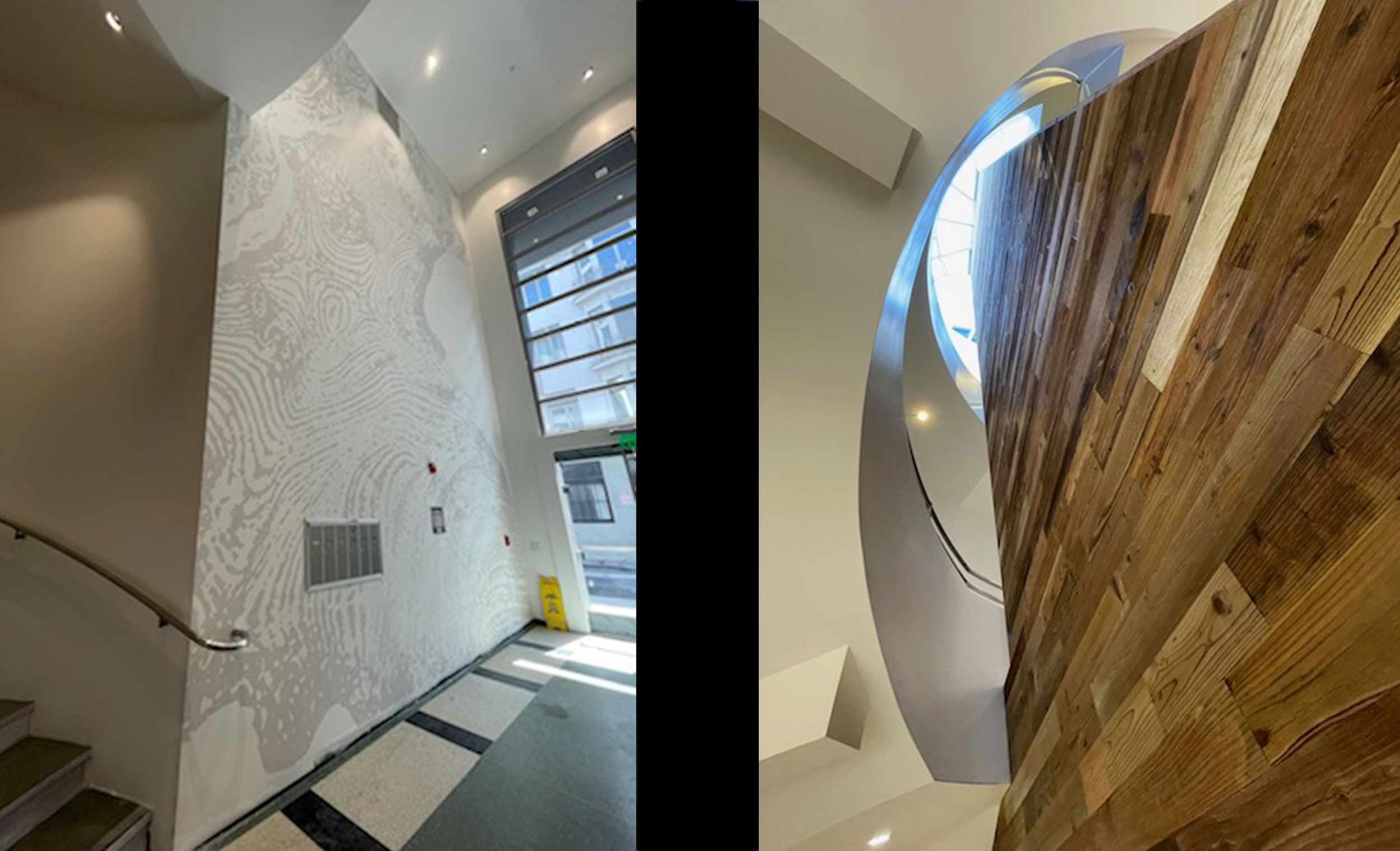 This San Francisco project included painting an entire three story elevator core surrounding walls, install custom Stikwood on the center three story elevator core and supply and install custom wall covering on a 26ft tall entrance lobby wall. This came out out perfectly. The client, owner, architect and Stikwood rep are all extremely impressed with how this approximately. 2,000 sq ft. project turned out. The architect’s office is in the building so there was some added stress on getting this done perfectly. Stikwood is a reclaimed lumber wall tile that comes in either “peel and stick” or traditional tack nail install. This project was tack nail installed due to the height of the walls. Stikwood worked with us in making custom edging which they have never made before.