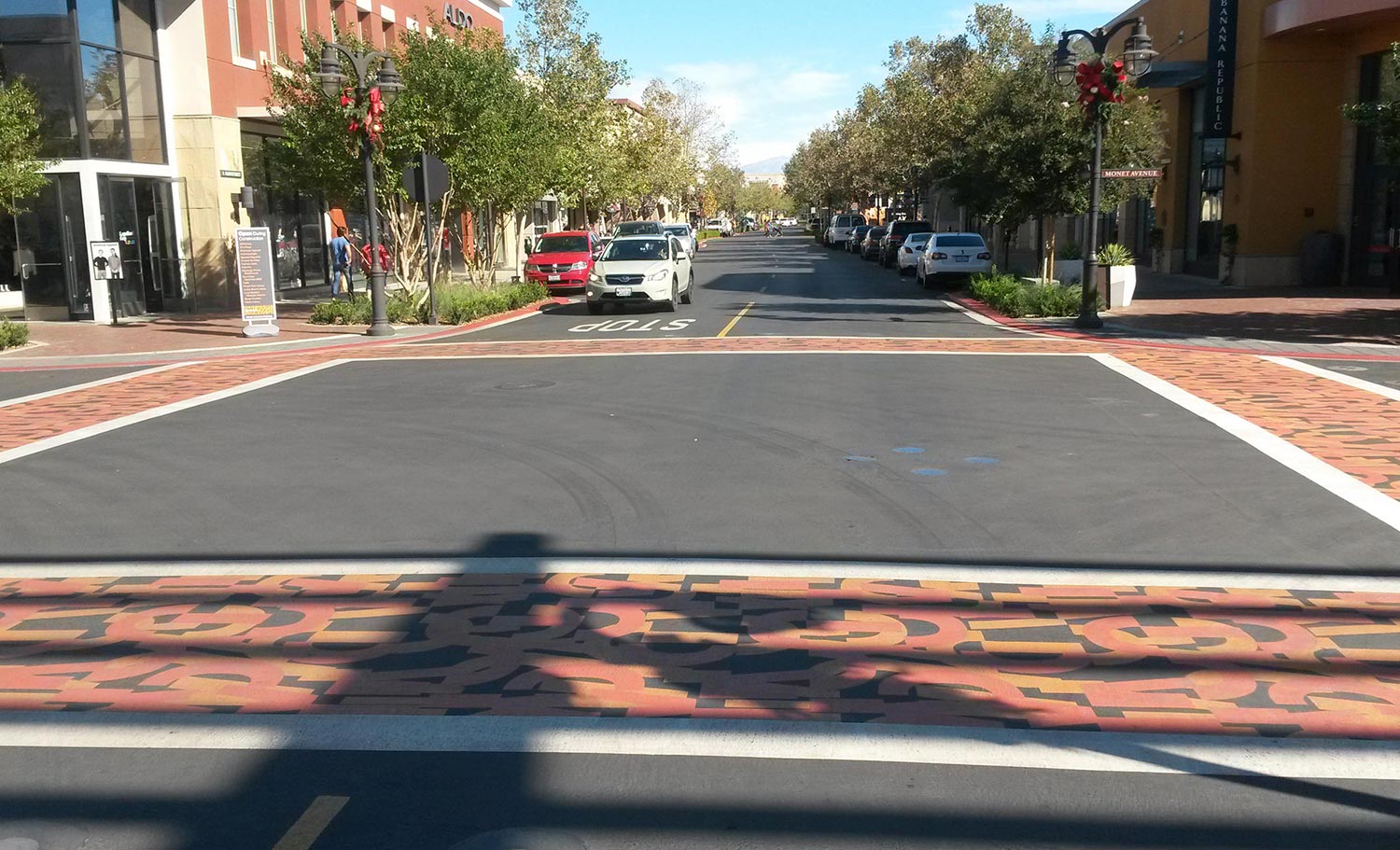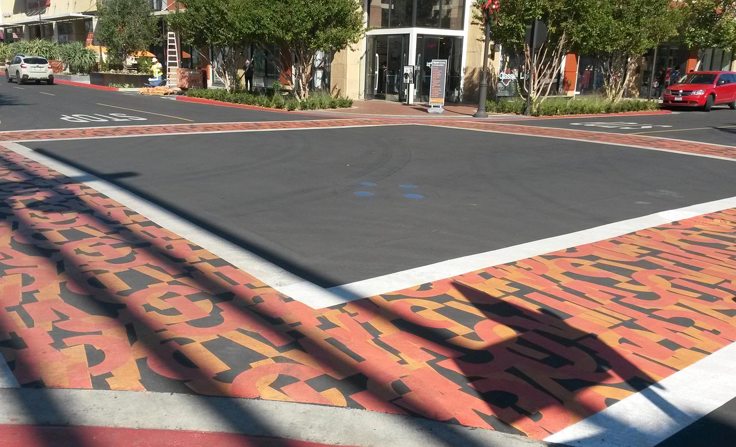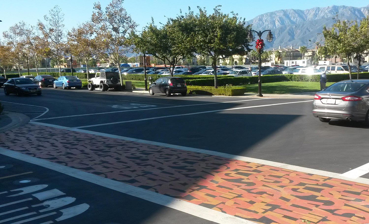 We were asked to apply multi-layered stencils with unique designs at the Victoria Gardens shopping center in Rancho Cucamonga California using traffic paint matched to very bright Pantone colors. Victoria Gardens needed skilled painters with an eye for detail to install these intricate graphics on the malls pedestrian walkways. This work was performed during night time hours requiring traffic control, lighting and lots of patience at this busy upscale mall. The five man crew finished the project in ten days.